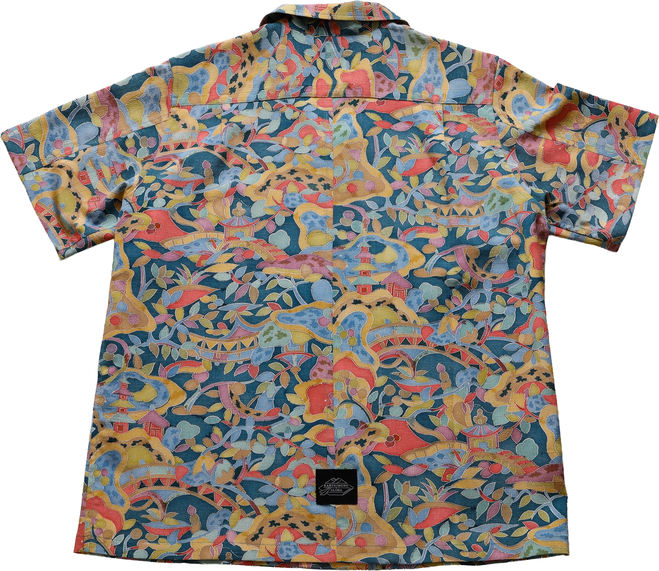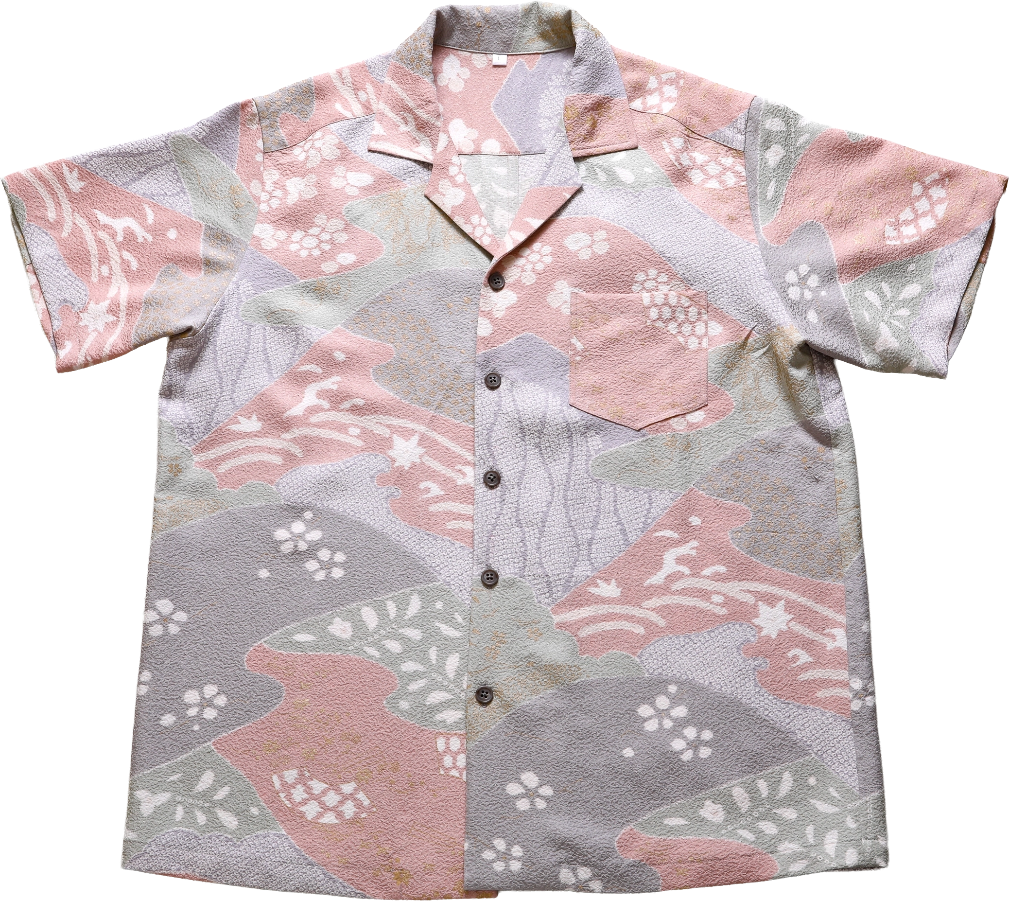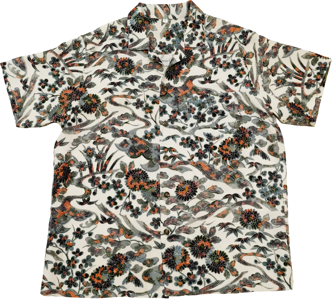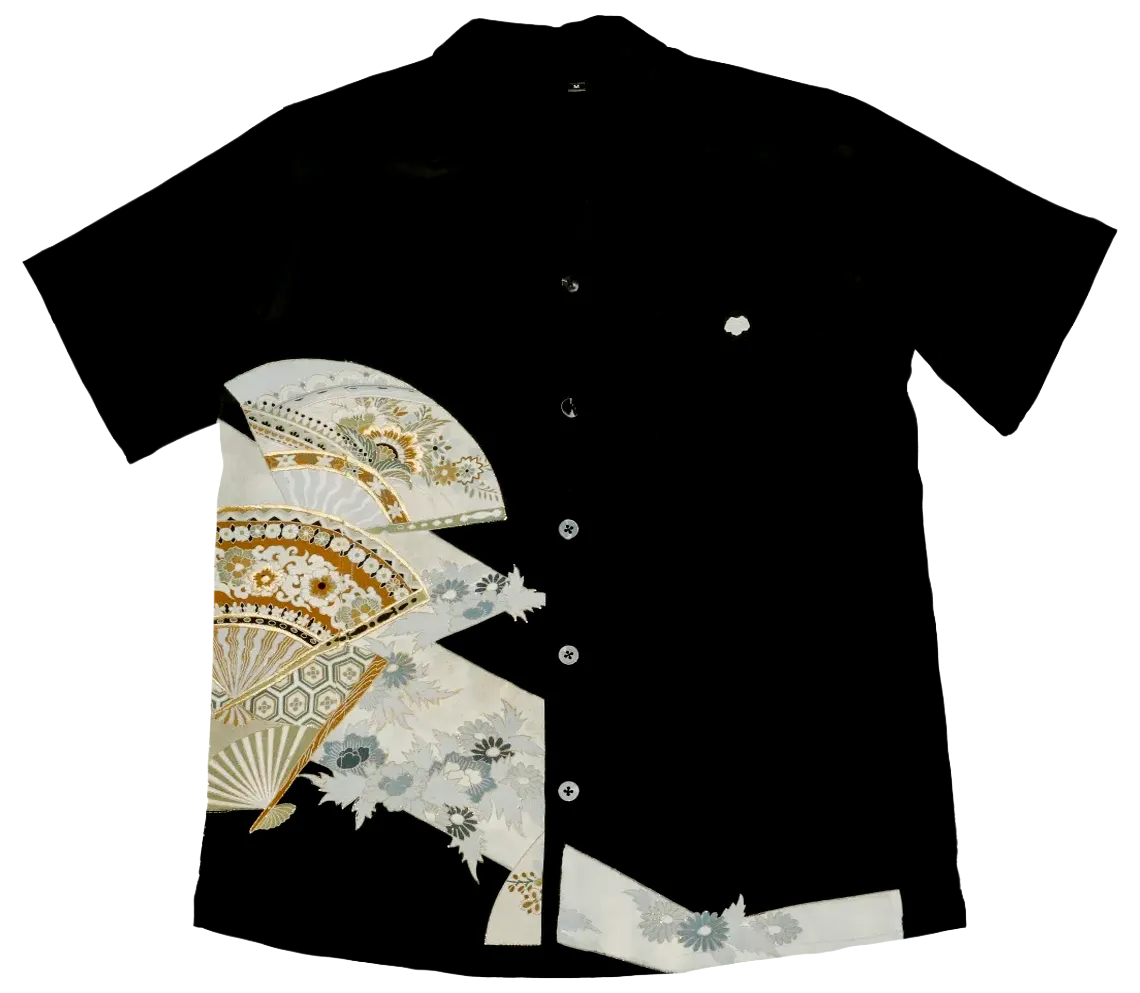 残念ながら今の日本では着物を着る方が一部の方だけになり、着物を簡単に処分する方もたくさん増えています。私たちは日本の大切な文化を残していきたいと考え昔に立ち戻り、ヴィンテージ着物でアロハシャツを仕立て、どなたでも手に取って気軽に着ていただきたいと考えました。 着物を一つ一つ糸を解いて、丁寧に洗い、今の時代に合うよう図柄合わせを綿密に考え、裏に縫い目が出ないように折り伏せ縫いで縫製いたしました。 絹で作られたアロハシャツはとても風合いがよく柔らかで、身体に馴染む大変着心地の良いアロハシャツに仕上がりました。また着物の柄ゆきは品格があり、エレガントな雰囲気を醸し出します。